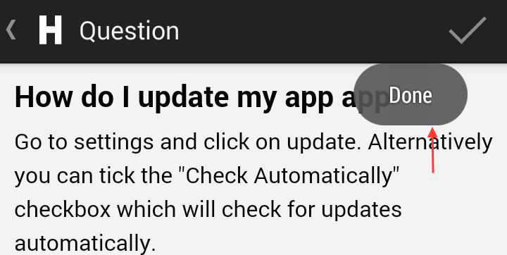 hs__done_btn | Helper text for the icon on single faq screen to exit the session without submitting the ticket. This button shows up when showSearchOnNewConversation is set to true and user click on a search result faq. ![]() | Done |